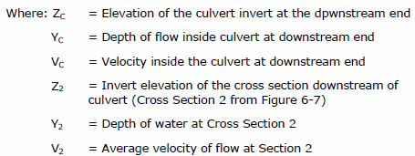 The first step in the direct step method is to compute the exit loss and establish a starting water surface inside the culvert. If the tailwater depth is below critical depth inside the culvert, then the starting condition inside the culvert is assumed to be critical depth. If the tailwater depth is greater than critical depth in the culvert, then an energy balance is performed from the downstream cross section to inside of the culvert. This energy balance evaluates the change in energy by the following equation.