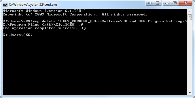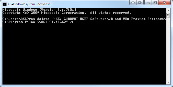 - Type the following at the command prompt (as a single line of text): reg delete “HKEY_CURRENT_USER\Software\VB and VBA Program Settings\C:\Program Files (x86)\CivilGEO” /f