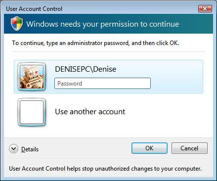 - If you have administrator rights, move to step 5. Otherwise, a User Account Control dialog box will appear asking for the administrator user name and password. Fill-in the administrator name and password and click the [OK] button.